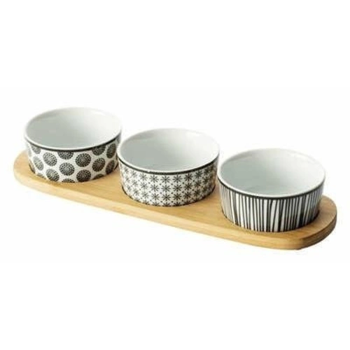 Przedstawiamy zestaw do przystawek od marki 5five simply smart! Zestaw składa się z trzech porcelanowych miseczek oraz tacy, która została wykonana z drewna bambusowego.