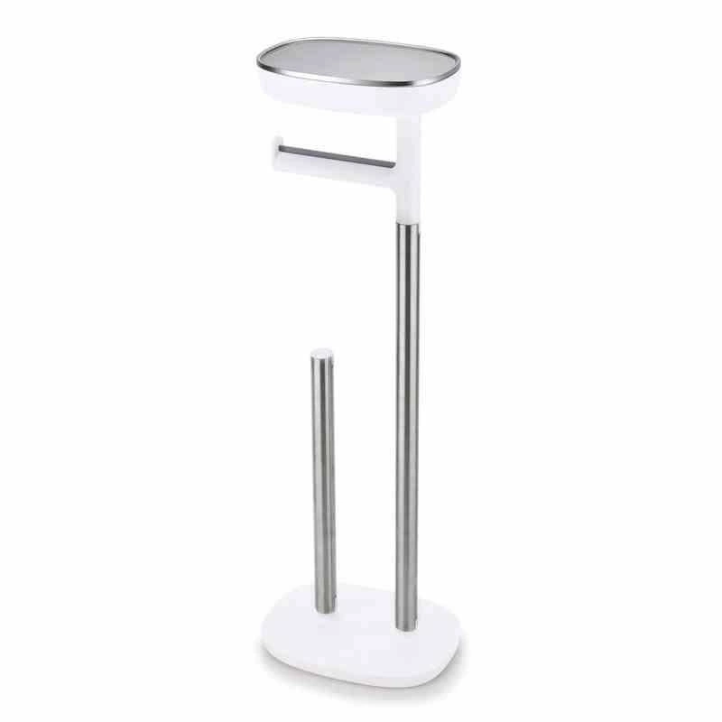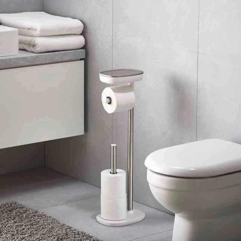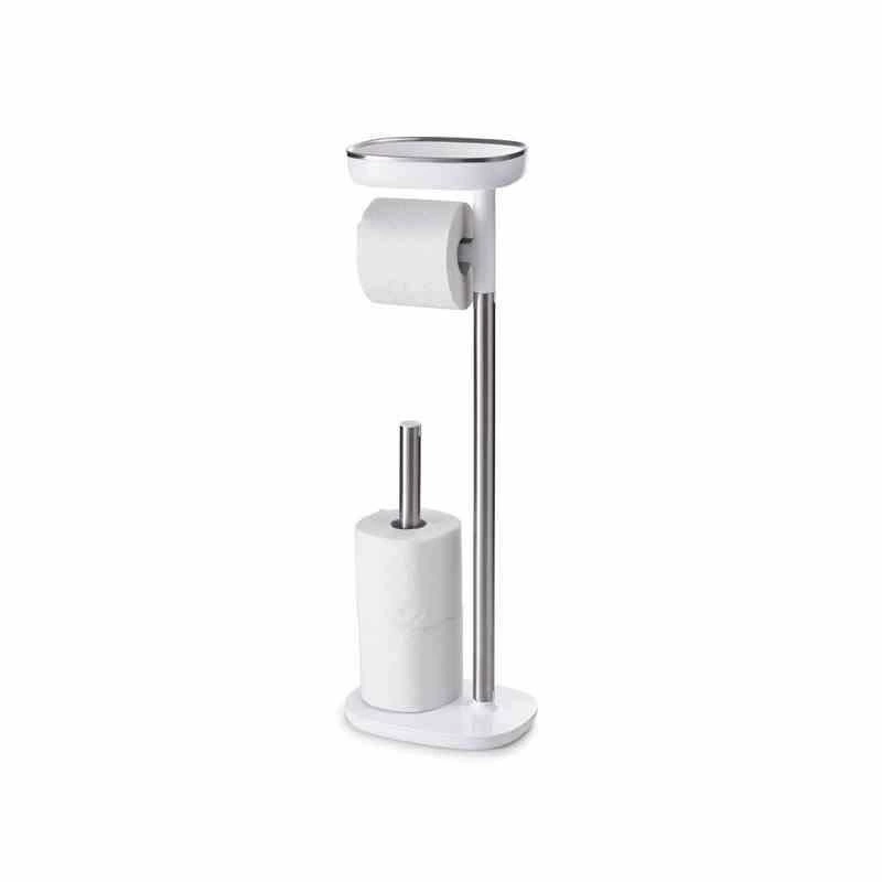 Stojak łazienkowy wolnostojący Joseph Joseph nie wymaga montażu do ściany, co pozwala na łatwą zmianę miejsca i ustawienie go tam, gdzie najbardziej go potrzebujesz. Funkcjonalna konstrukcja umożliwia szybkie i wygodne wymienianie rolek papieru, a stabilna podstawa zapewnia bezpieczeństwo użytkowania. Szerokość 16,5 cm pozwala na ustawienie stojaka nawet w bardzo małej toalecie, nie ograniczając swobody ruchów.