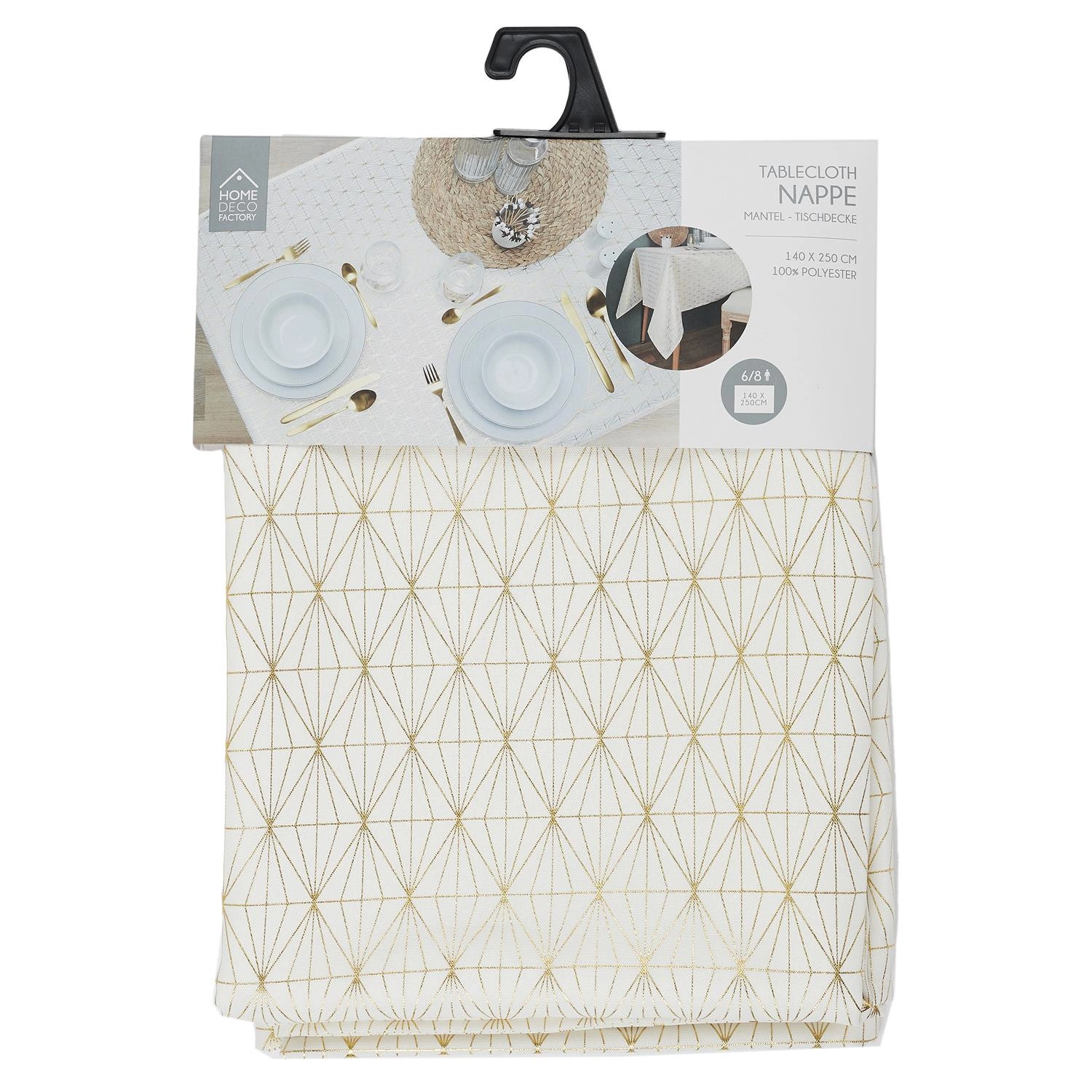 Nowoczesny design obrusu Geometric Dore opiera się na wyrazistych, geometrycznych zdobieniach, które przyciągają wzrok i stanowią efektowną dekorację stołu. Biało-złota kolorystyka harmonizuje z aranżacjami glamour oraz współczesnymi wnętrzami, wprowadzając do nich odrobinę blasku i wyrafinowania. Taki obrus na stół nie tylko podkreśli odświętny charakter uroczystości, ale również sprawdzi się na co dzień jako elegancki element wystroju.