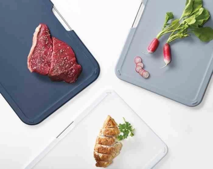 - Trzy odrębne deski w różnych kolorach – łatwiejsza higiena i przypisanie deski do konkretnego typu produktów spożywczych