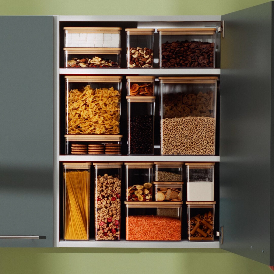 Pudełka Eske występują w różnych pojemnościach, od 500 ml do aż 4300 ml, co sprawia, że każdy znajdzie idealne rozwiązanie dla swoich potrzeb – czy to małe pudełko na przyprawy, czy duże na makarony lub płatki śniadaniowe. Transparentne ścianki pozwalają łatwo rozpoznać zawartość, co jest szczególnie przydatne w szybkim życiu codziennym. Dodatkowo, bambusowe pokrywki nie tylko pięknie komponują się z estetyką każdej kuchni, stylu frontów czy tekstyliów, ale także są ekologiczne i zapewniają szczelne zamknięcie, chroniąc jedzenie przed wilgocią i zachowując jego świeżość. Pojemniki do przechowywania żywności sypkiej pomagają pozbyć się z kuchni nieestetycznie wyglądających opakowań po produktach, takich jak mąka czy cukier. Wnętrze szafek wygląda o wiele schludniej. Myśląc o tym, aby zastosować w swojej kuchni pojemniki na żywność, zestawy wypadają o wiele lepiej niż szukanie pojedynczych pojemników. Ich wygląd jest spójny i estetyczny. Można je wstawić do szafki lub postawić na odkrytej półce.