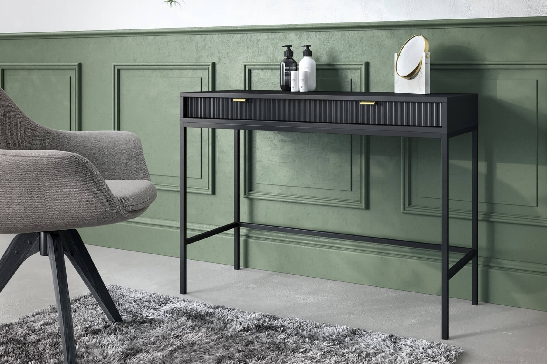 Najlepsza cenaNowoczesna toaletka Delicious czarna z ryflowanymi szufladami i złotymi nogami do sypialni