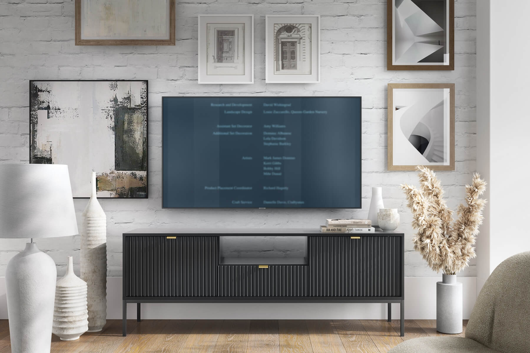 Najlepsza cenaSzafka RTV Delicious czarna ryflowana z szufladą na wysokich złotych nogach 154 cm do salonu