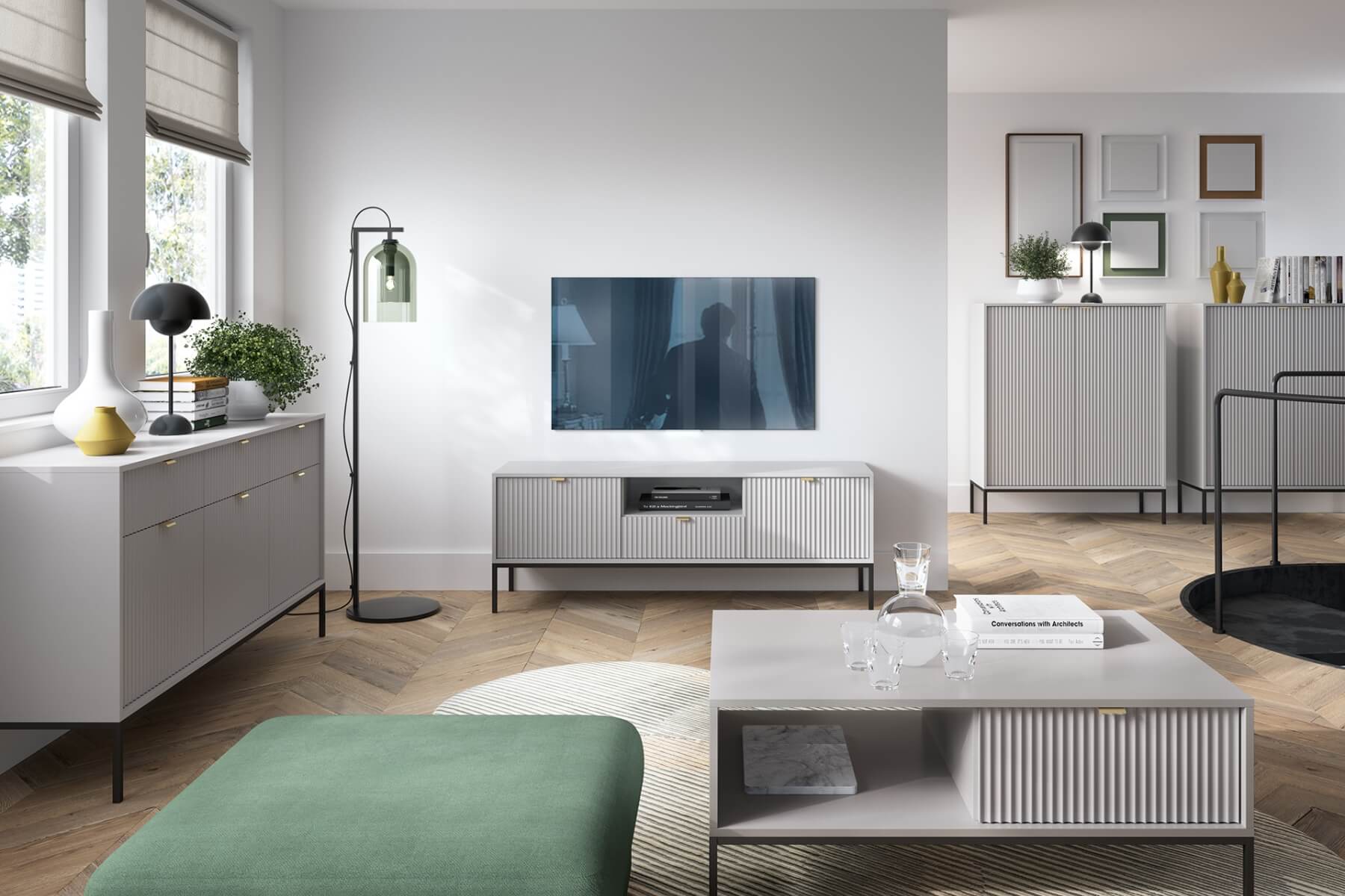 Najlepsza cenaSzafka RTV Delicious szara ryflowana 154 cm na złotych nogach nowoczesna do salonu Intesi