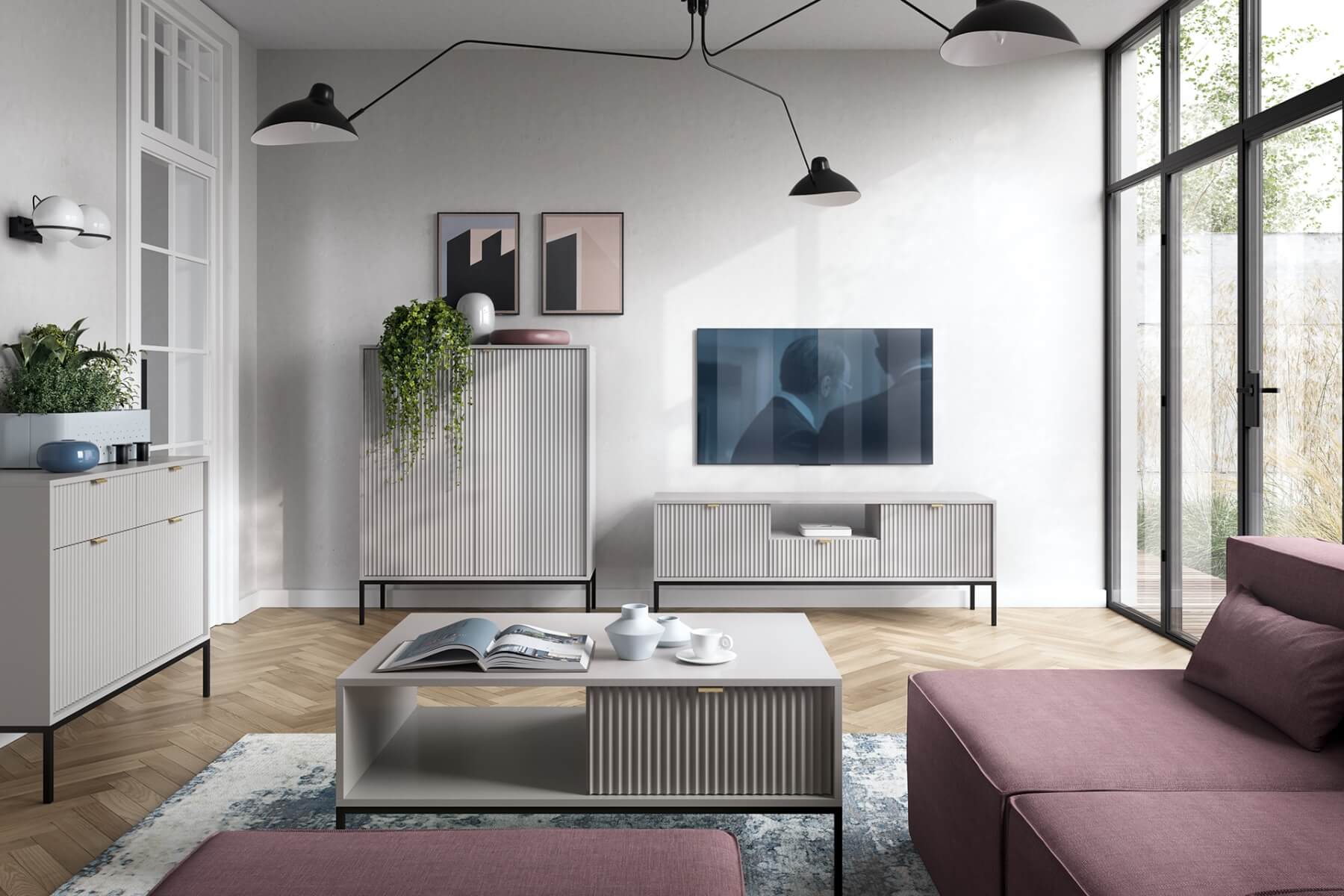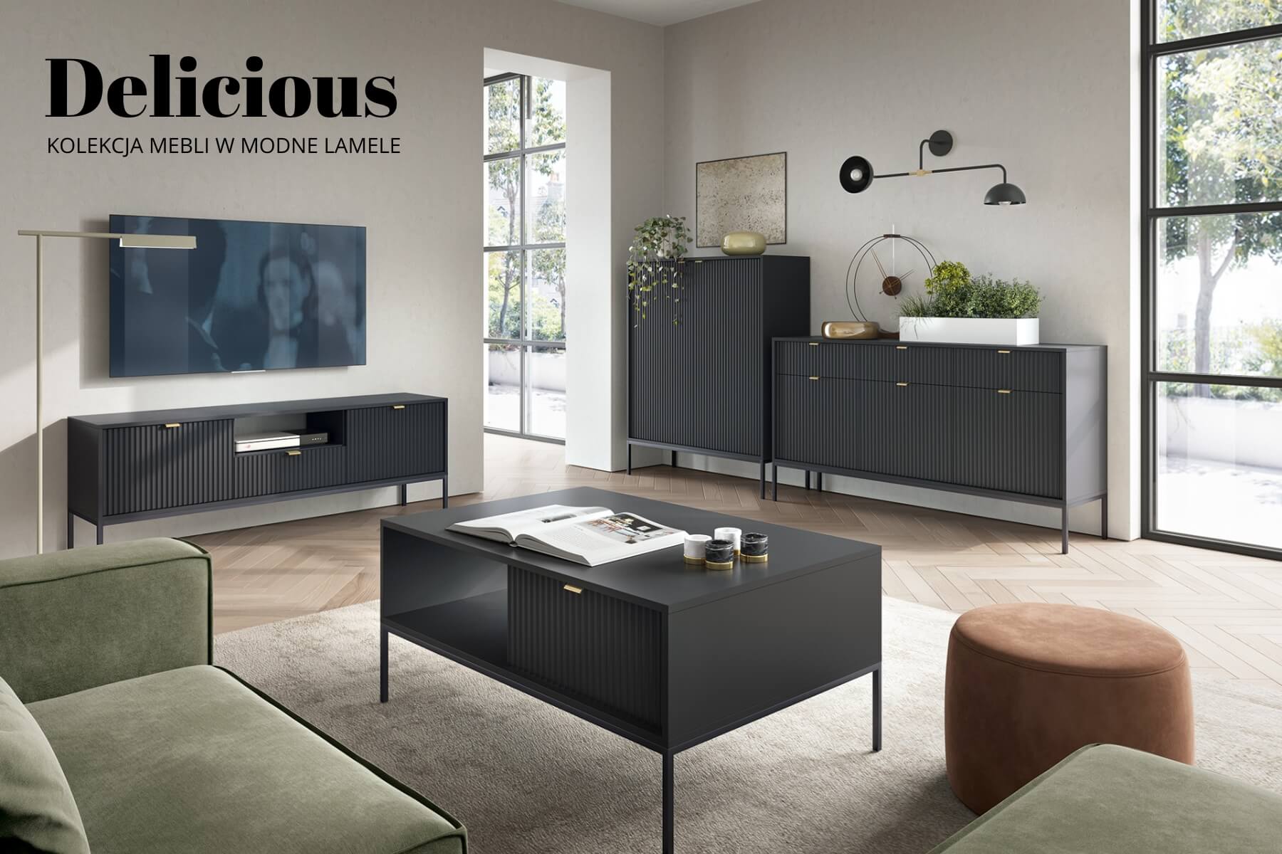 Delicious warto wykorzystać jako nowoczesne meble do salonu. Klasyczna kolekcja, którą reprezentują meble ryflowane, to doskonałe rozwiązanie do wnętrz salonów w stylu nowoczesnym, glamour i klasycznym. Wysokie komody na nóżkach, szafki rtv czy konsole zapewnią dużo miejsca na sprzęty i przechowywanie różnych przedmiotów. Fronty wykonane z płyty ryflowanej MDF zapewnią dodatkowy efekt plastyczny, a wysokie nóżki ułatwią sprzątanie pod meblem, ponieważ pozwolą na swobodne odkurzanie i zmywanie podłogi. Przemyśl aranżację salonu z meblami Delicious!