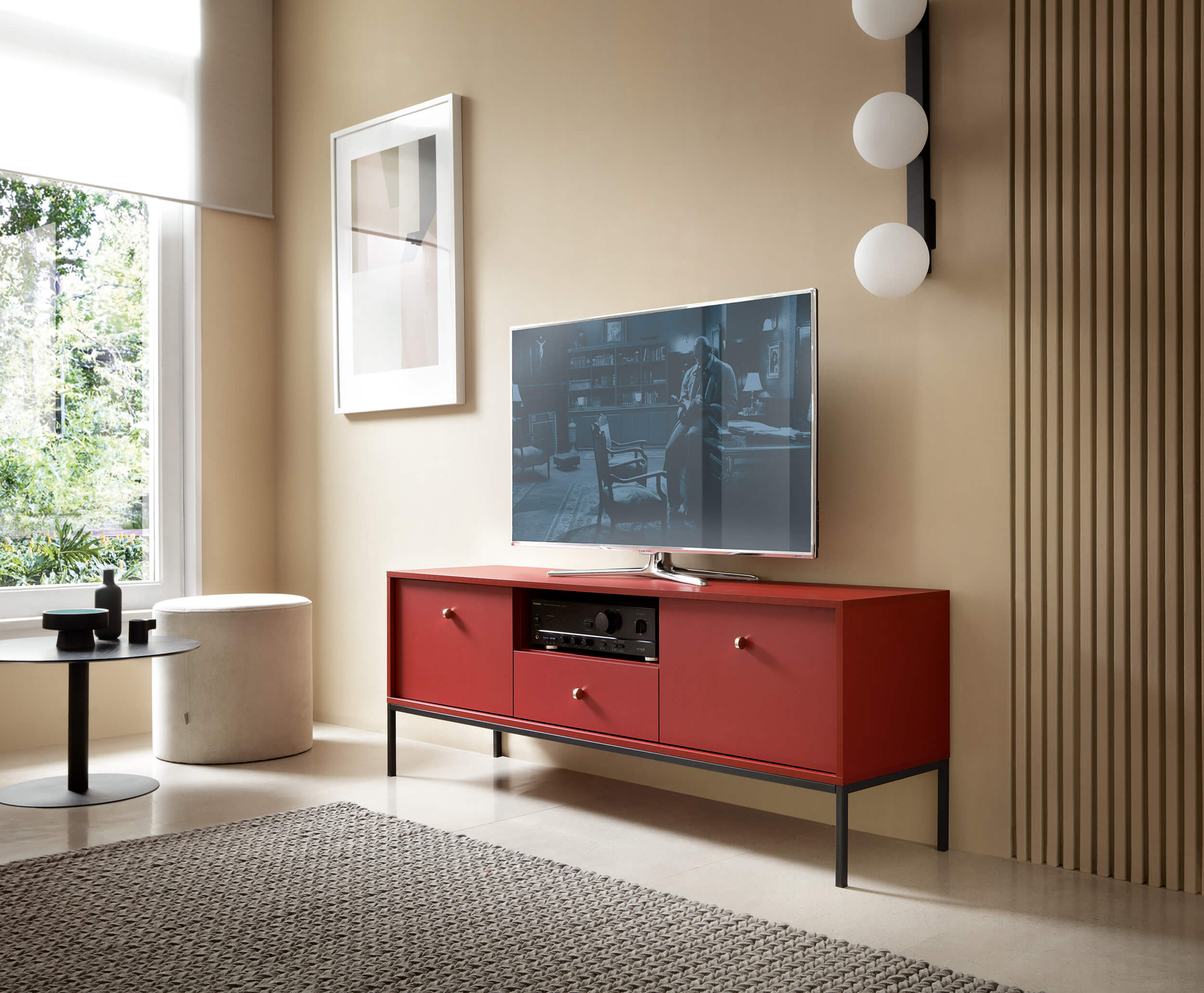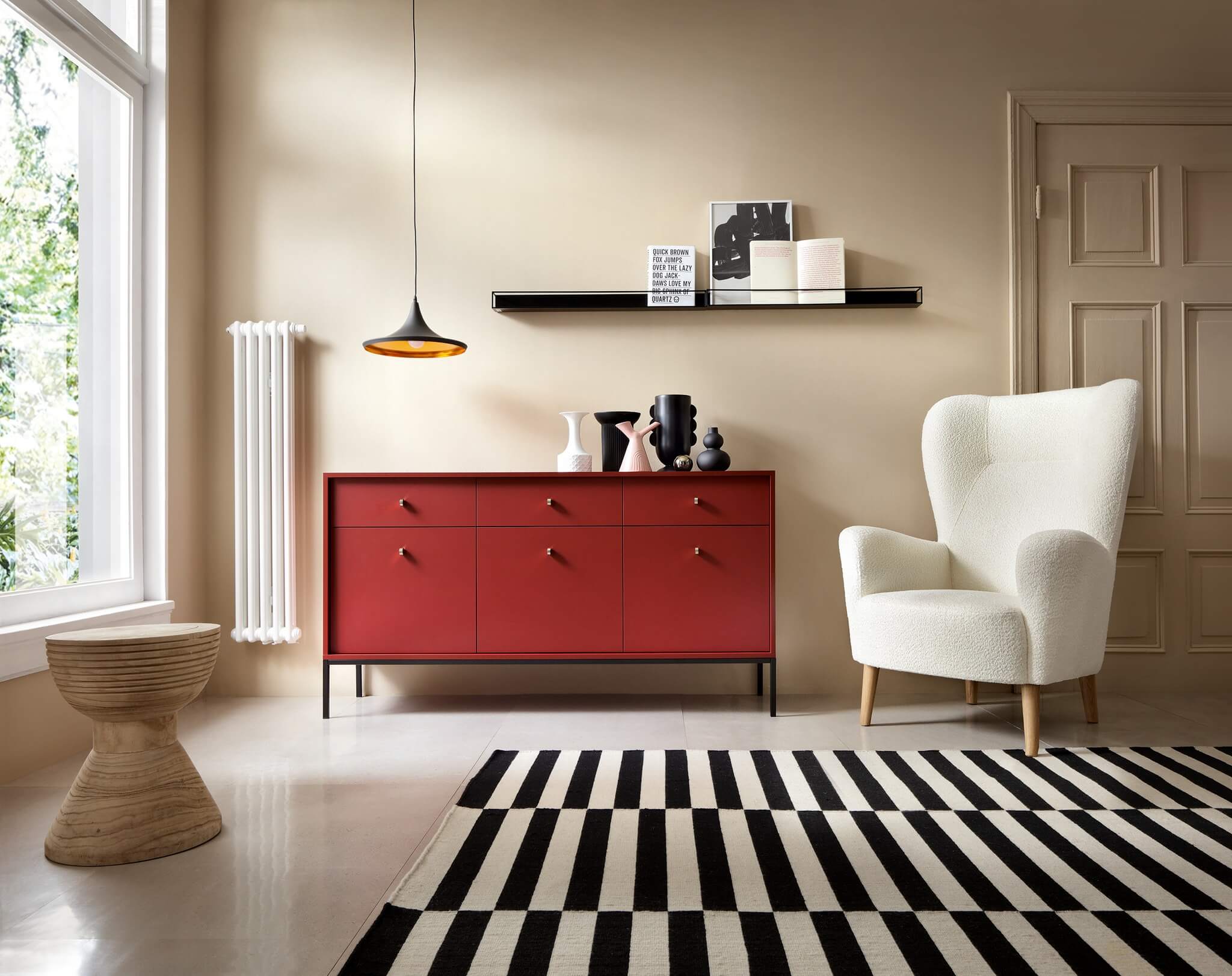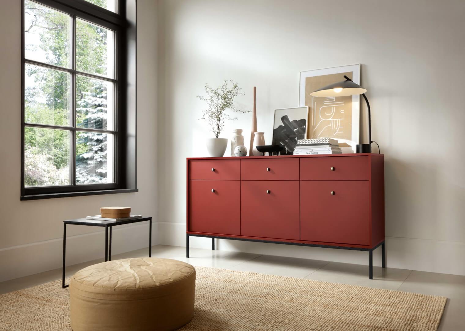 Wystrój pokoju dziennego projektowany jest zazwyczaj w uniwersalnych stylach aranżacji wnętrz. Kolorystyka i wyposażenie ma odpowiadać wszystkim mieszkańcom domu, a jednocześnie być przyjemna dla gości i bliskich. Kolekcja nowoczesnych mebli Evora jest idealna do aranżacji pokoju dziennego. Jej prosta, wręcz minimalistyczna forma jest jednocześnie przyciągająca wzrok, jak i wtapiająca się w otoczenie. Są to meble wykonane z laminowanej płyty meblowej, wykończone subtelnymi uchwytami i postawione na prostych smukłych nogach z metalu. Trzy dostępne kolory — granatowy, bordowy i beż będą pasować do nowoczesnego salonu, gdzie roztoczą aurę klasycznego modernizmu. Płyty meblowe są świetną alternatywą litego drewna. Posiada gładką powierzchnię, która jest prosta do utrzymania w czystości, a jednocześnie wygląda wyjątkowo minimalistycznie. Nowoczesny styl mebli przejawia się także w liniowych podziałach szuflad i frontów. Takie zabiegi stosowali prowodyrzy stylu modernistycznego w najczystszej formie, co stało się inspiracją do powstania kolekcji Evora.