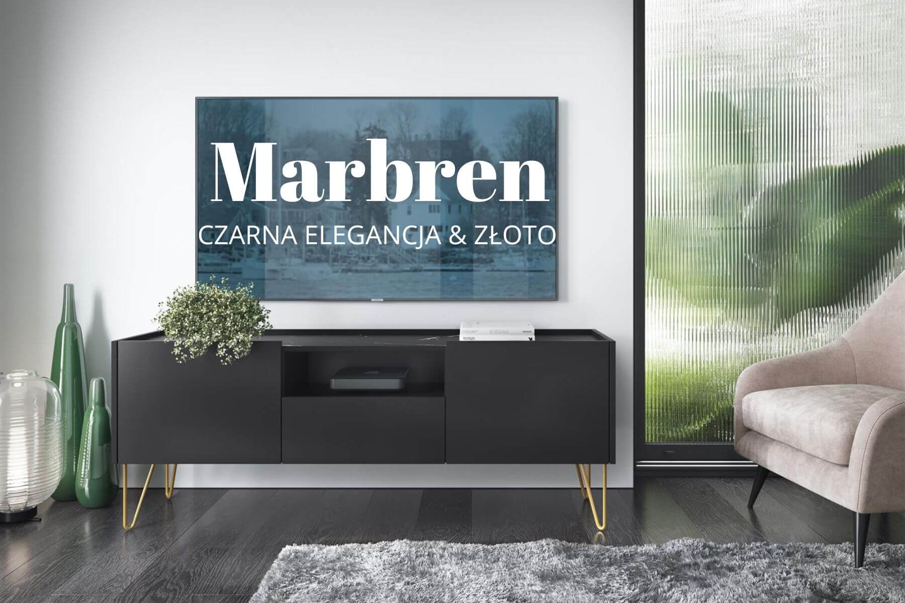 - Jeśli szukasz czarnych mebli do salonu — Marbren to kolekcja dla Ciebie. Zawiera się w niej: czarna komoda w kilku wersjach, stolik kawowy i szafka rtv. Jest to najważniejsze wyposażenie salonu, dzięki czemu nie musisz martwić się o poszukiwania kolejnych mebli, bo wszystko masz w jednym zestawie.