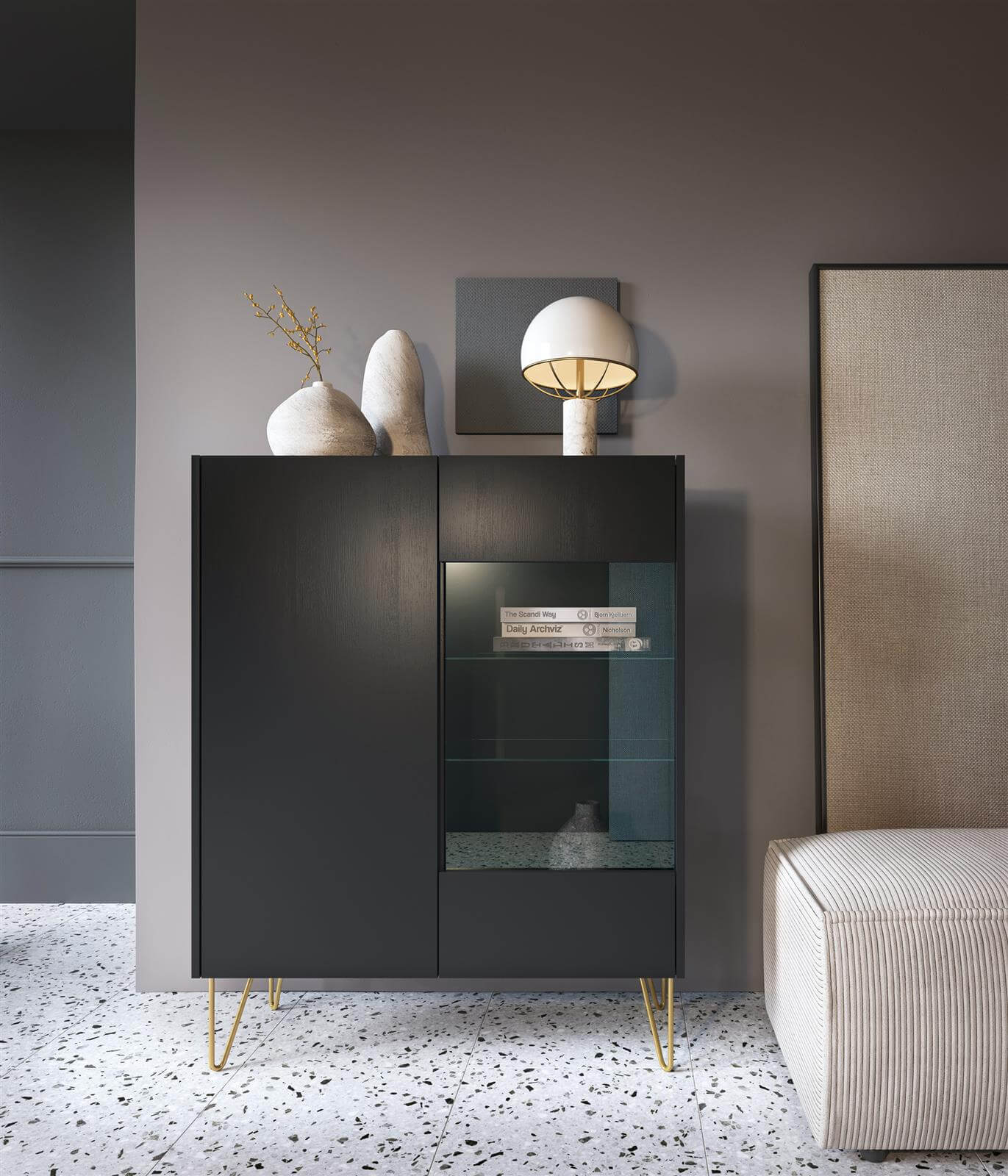 - Czarne meble nadają wnętrzom eleganckiego wyrazu. Marbren powstał z płyty laminowanej o strukturze ciemnego drewna, płyty imitującej marmur oraz złotej podstawy. Te materiały sprawiają, że kolekcja będzie idealna do wnętrz w stylu glamour i takich, w których chcesz uzyskać charakter luksusu i bogactwa.